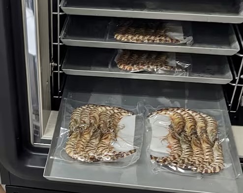 マイナス35℃のプレハブ冷凍庫で保管し、さらに真空した海老を発泡容器に入れて密閉保管しています。霜取り運転時も温度変化を最小限に抑えられるため、この方法なら半年以上経っても品質に問題はありません。一般的なマイナス20℃の冷凍庫だと、真空していても冷凍焼けが起きやすい。保管は非常に重要だと思います。