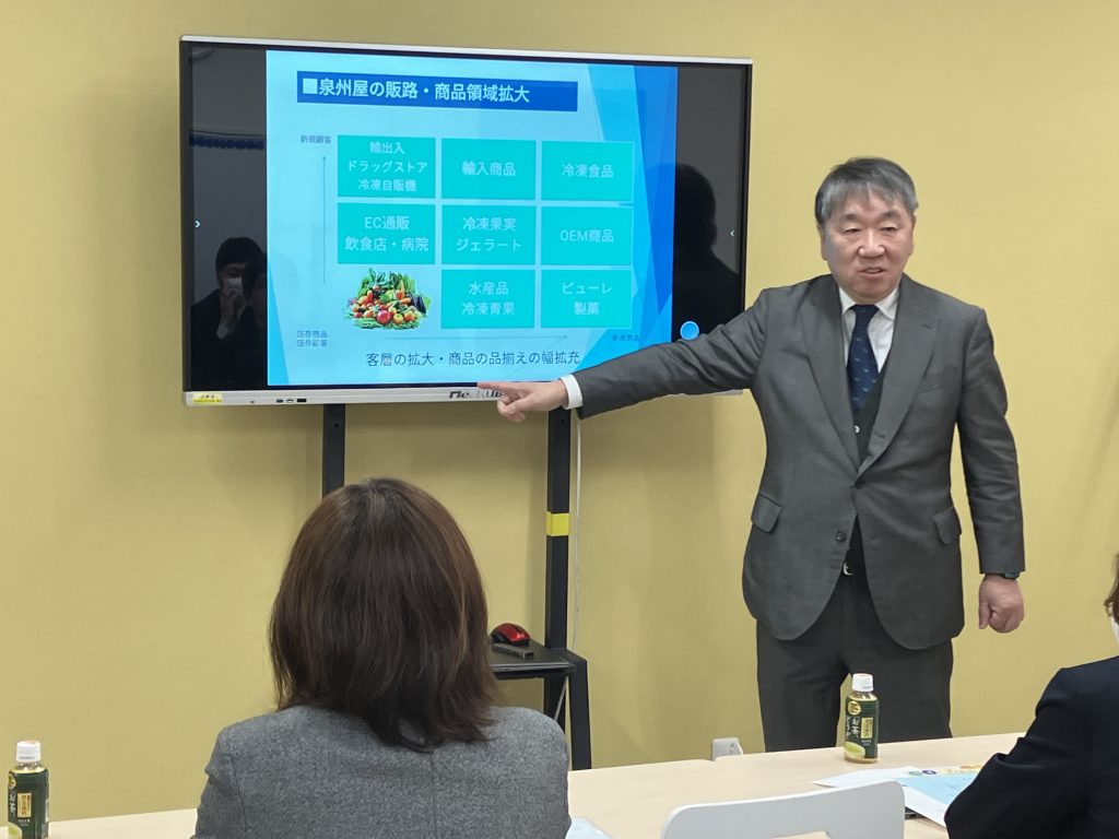 続いて、泉州屋の秋山会長より、同社のビジネスモデルや、冷凍事業開始の背景について紹介しました。