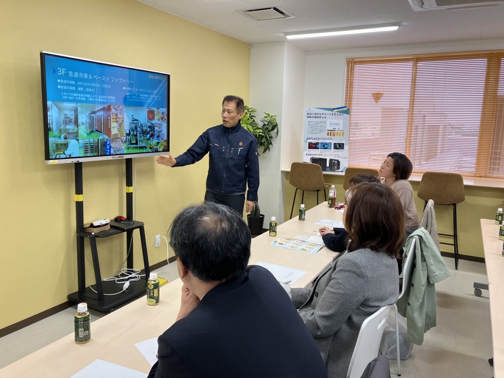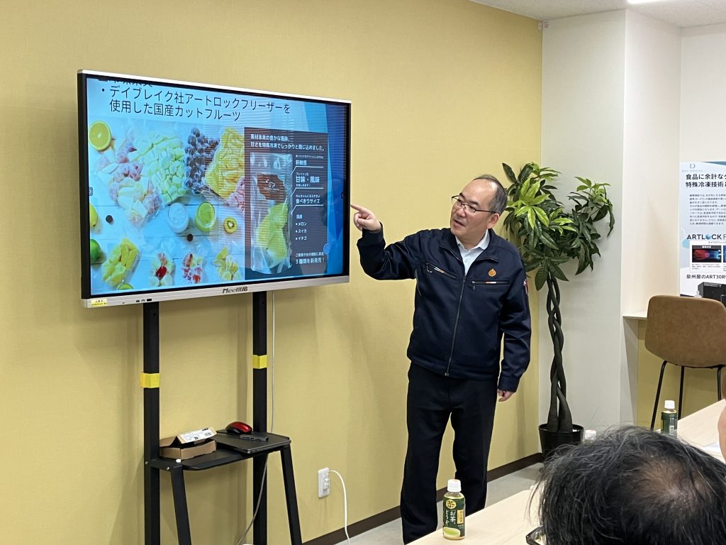 セミナー冒頭では、デイブレイク代表の木下より、デイブレイクの取り組みとアートロックフリーザーの概要について説明。泉州屋に導入されている大型機についても触れながら、現時点では導入比率はまだ一部に留まるものの、近年問い合わせが増加していることが共有されました。また、世界的に冷凍市場は拡大を続け、日本国内でも同様の成長が見込まれています。こうした背景から、高品質な冷凍食品の製造・流通に取り組む事業者が増えている点を強調しました。
