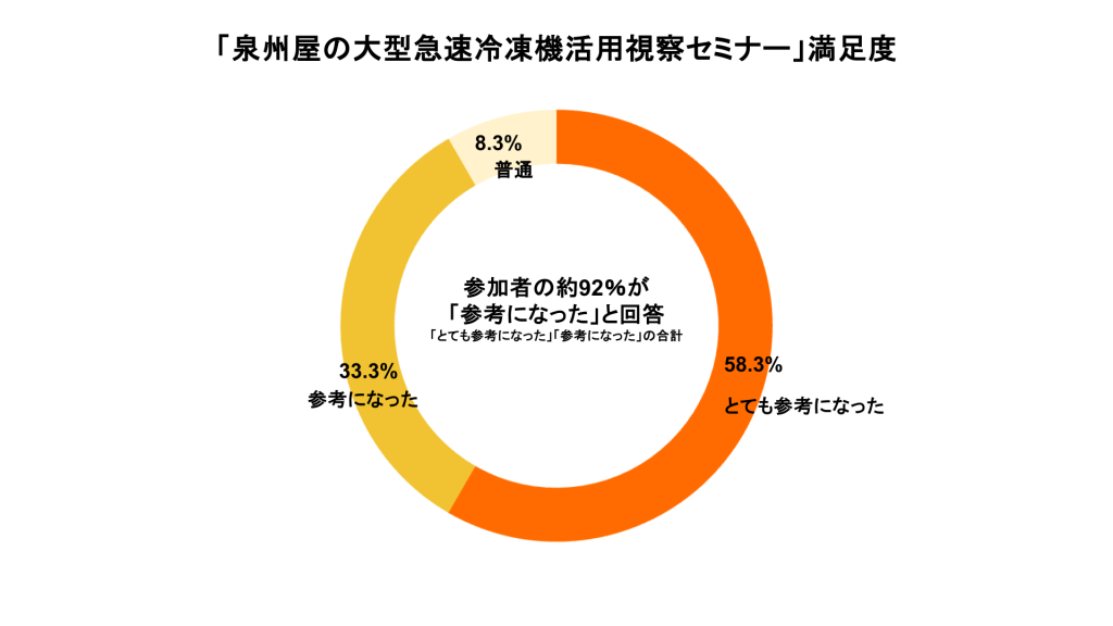 今回の視察セミナーは、都市型工場という立地戦略と、大型急速冷凍機の実運用を掛け合わせた内容でした。参加者アンケートでは、「非常に参考になった」「実際の運用イメージが具体的に湧いた」といった声が多く寄せられ、約92%が「参考になった」と回答。満足度の高さがうかがえます。