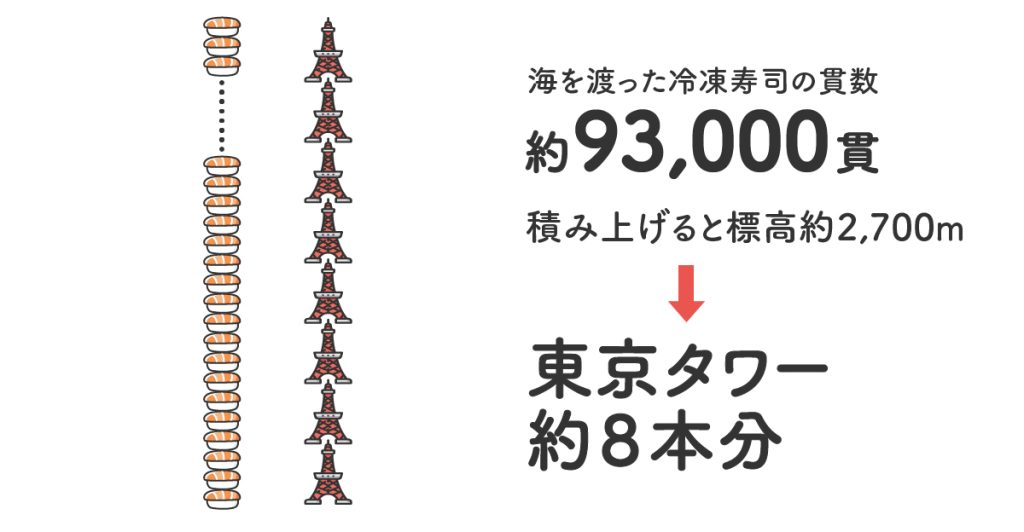 デイブレイクが手掛け、海外に渡った冷凍寿司の総貫数は約93,000貫でした。これは、積み上げると 標高約2,700m、高さに換算すると 東京タワー約8本分 に相当します。冷凍寿司が世界へスケールする可能性を示す数字です。