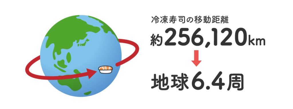 海外輸出や展示会出展、サンプル送付などを含む、冷凍寿司が移動した距離は、256,120kmでした。これは、地球6.4週分に相当します。世界各地へ足を運びながら、冷凍寿司は進化してきました。