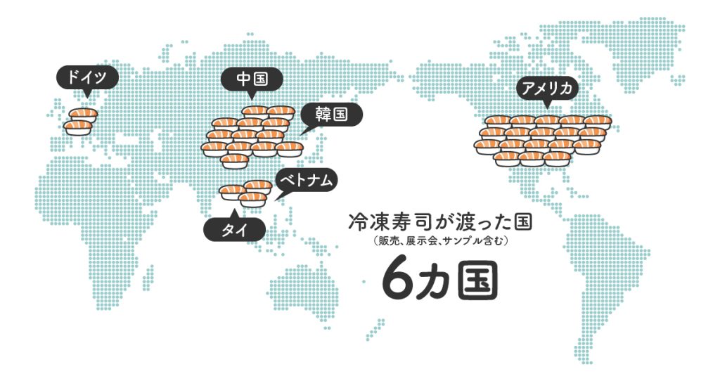 海外輸出や展示会出展、サンプル送付などを含む、冷凍寿司が渡ったことのある国は6カ国(アメリカ、ドイツ、タイ、ベトナム、中国、韓国)です。それぞれの国で、高い評価を獲得してきました。