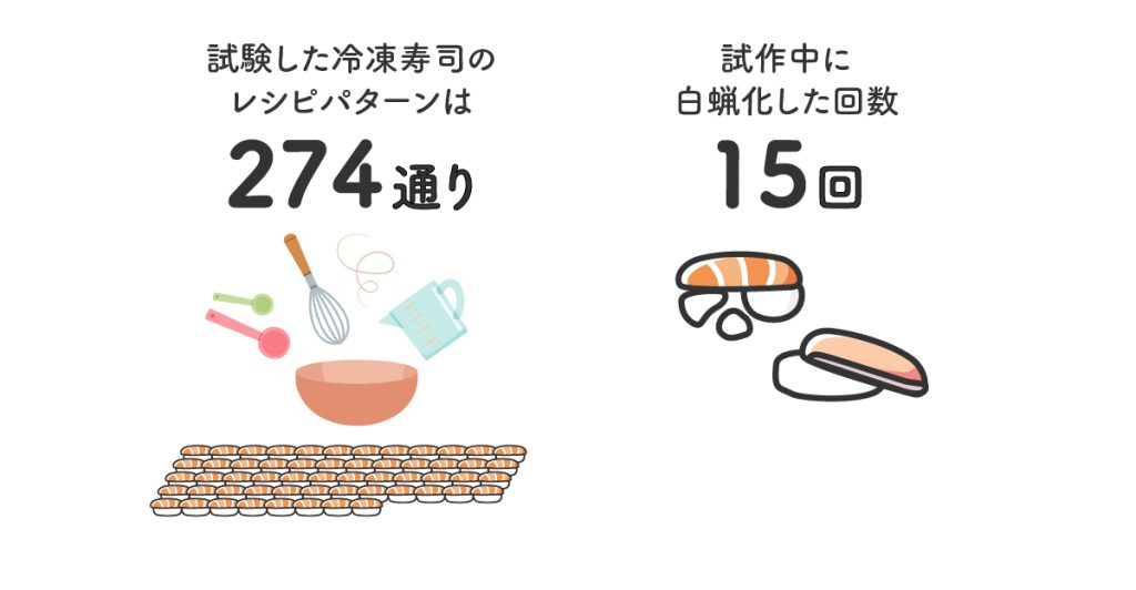 輸送方法によっては現地到着までに1ヶ月以上がかかり、温度変動のリスクがある海外輸送でも品質を保持するとともに、寿司の解凍工程で最も難しいとされる冷蔵解凍にも対応できる冷凍寿司を開発するために、試したレシピパターンは274通りでした。また、試作中に白蝋化(ご飯がボソボソと崩れ落ちるような食感が悪くなってしまう現象)した回数は15回。最適解を求めて改良を繰り返してきたことで、現在の品質に到達しています。