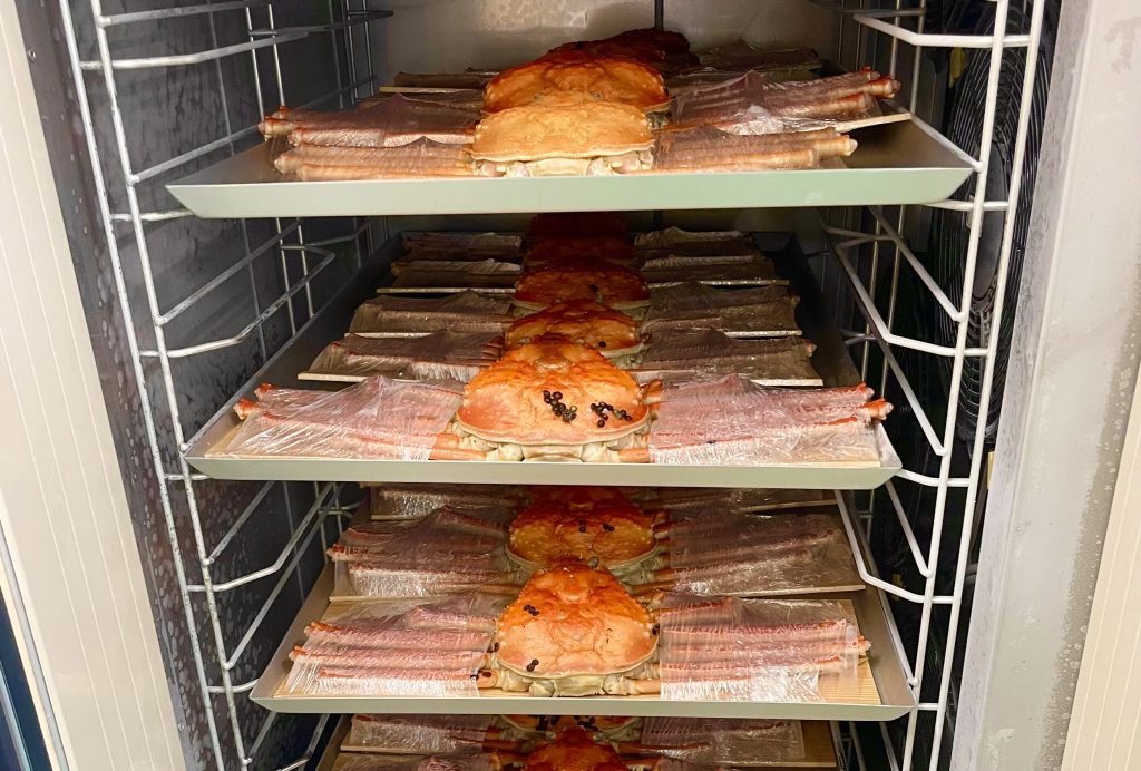 導入したのは2024年11月です。それまでは-60℃の保管庫を使っていましたが、あくまで保管用で「美味しく凍らせる」機能はありませんでした。冷凍の主力であるカニは、需要が年末に集中し、価格も2倍3倍に高騰します。その反面、在庫が確保できないと販売機会を逃してしまう。この機会ロスを解消するには冷凍しかないと考え、さまざまな冷凍機を比較。品質とサポートの両面で信頼できると感じたデイブレイクのアートロックフリーザーを導入しました。