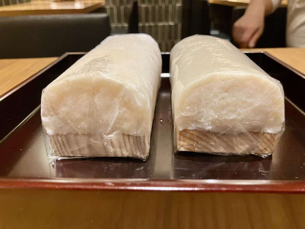 かまぼこにわさびを添えた一品料理、「板わさ」に使っています。前日に必要な分だけ冷凍庫から冷蔵庫へ移し替えて、冷蔵解凍します。あとは、解凍したかまぼこを切って並べるだけ。本当にシンプルですね。現在は、六本木ヒルズ店と麻布台ヒルズ店の2店舗で提供していて、1店舗あたり月間で約150食ほど出ています。