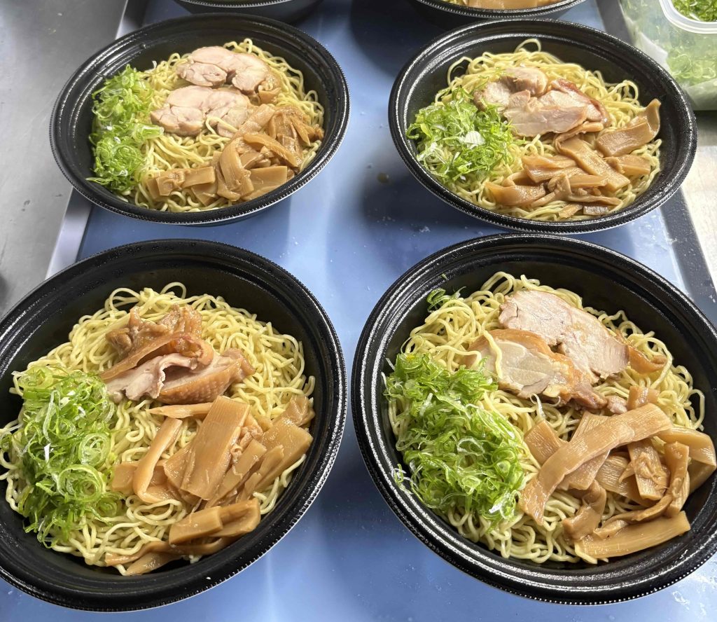 東広島のブランド食材である「こい地鶏」を使った冷凍ラーメンを、約1年前から開発しています。いよいよ販売できるレベルまで仕上がってきたので、この商品も「わっぱ飯」シリーズと同様、冷凍でEC販売する予定です。電子レンジで8〜10分温めるだけで食べられるラーメンで、スープも具材もすべて入っています。まずスープを凍らせて、その上に麺、さらに具材を重ねて冷凍。スープにはこい地鶏の出汁を使用しており、旨味が非常に豊かです。冷凍しても、その味わいがしっかり再現できます。