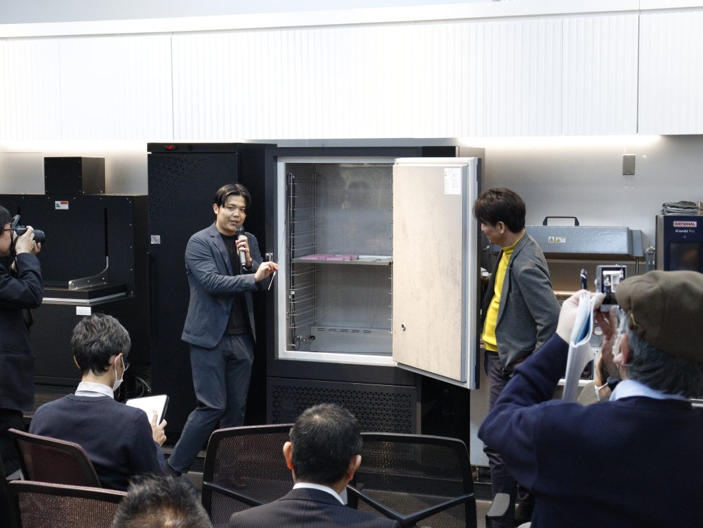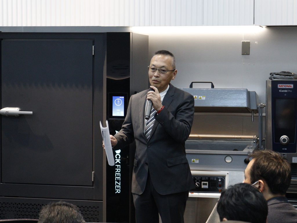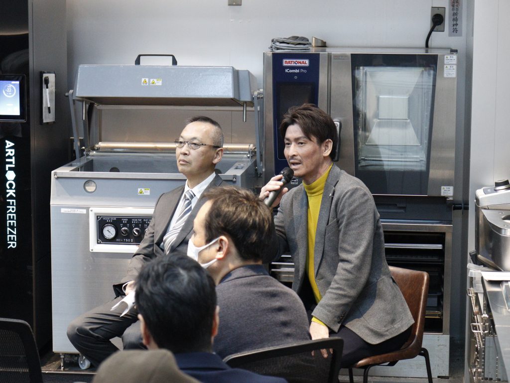 イベント後半では、アートロックフリーザーを用いた凍結実演が行われました。デイブレイクのエリアマネージャー宮寺が、気流の特徴やファン構造について解説しながら、実際の凍結工程を紹介。かまぼこの冷凍においても、生の状態への再現性が高いことを述べました。