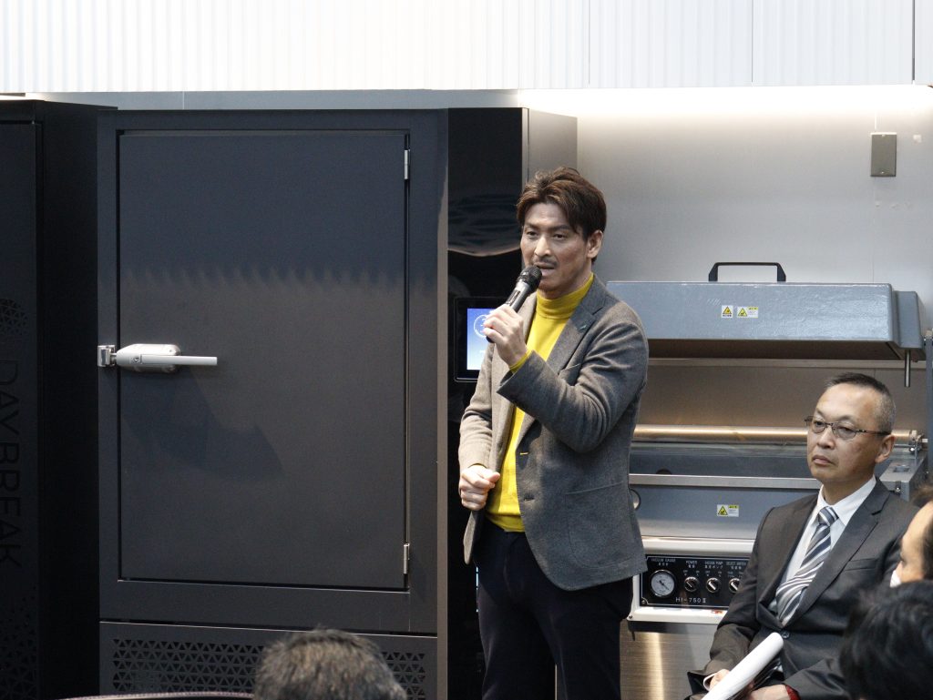 まずはじめに、デイブレイク代表の木下より、デイブレイクの取り組みについて紹介。 特殊冷凍機アートロックフリーザーの販売を行うだけでなく、調理・保管・解凍といった各オペレーションにおいても、業界ごとの専門企業と連携しながらサポートを行っていることを紹介しました。そして、「今回のイベントは、近年さまざまな課題が生じているかまぼこ業界において、冷凍技術がどのように貢献できるのかを、具体的に提案したいという思いから開催した」と述べ、技術紹介にとどまらず、現場に即した活用方法を共有する場であることを強調しました。